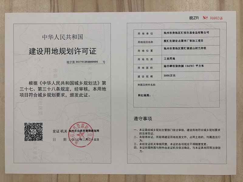 用地单位:池州市贵池区汇恒生态食品有限公司