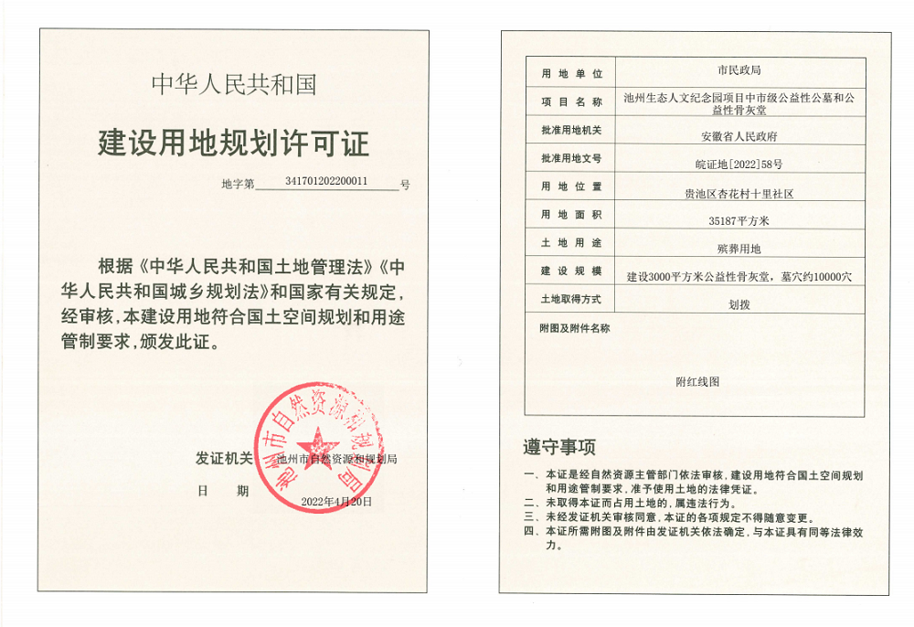 用地项目:池州生态人文纪念园项目中市级公益性公墓和公益性骨灰堂
