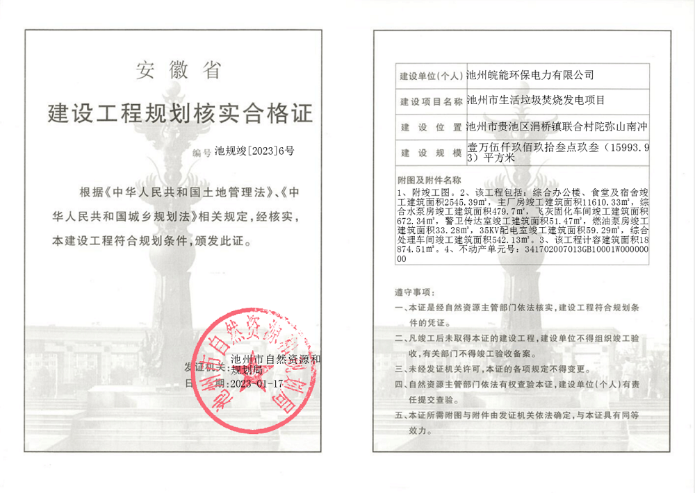 池州市生活垃圾焚烧发电项目《建设工程规划核实合格证》批后公布