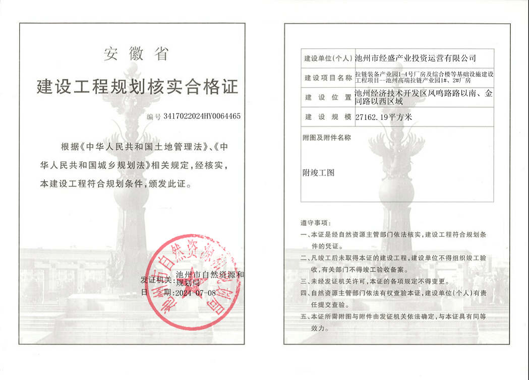 拉链装备产业园1-4号厂房及综合楼等基础设施建设工程项目--池州高端拉链产业园1#、2#厂房《建设工程规划核实合格证》批后公布