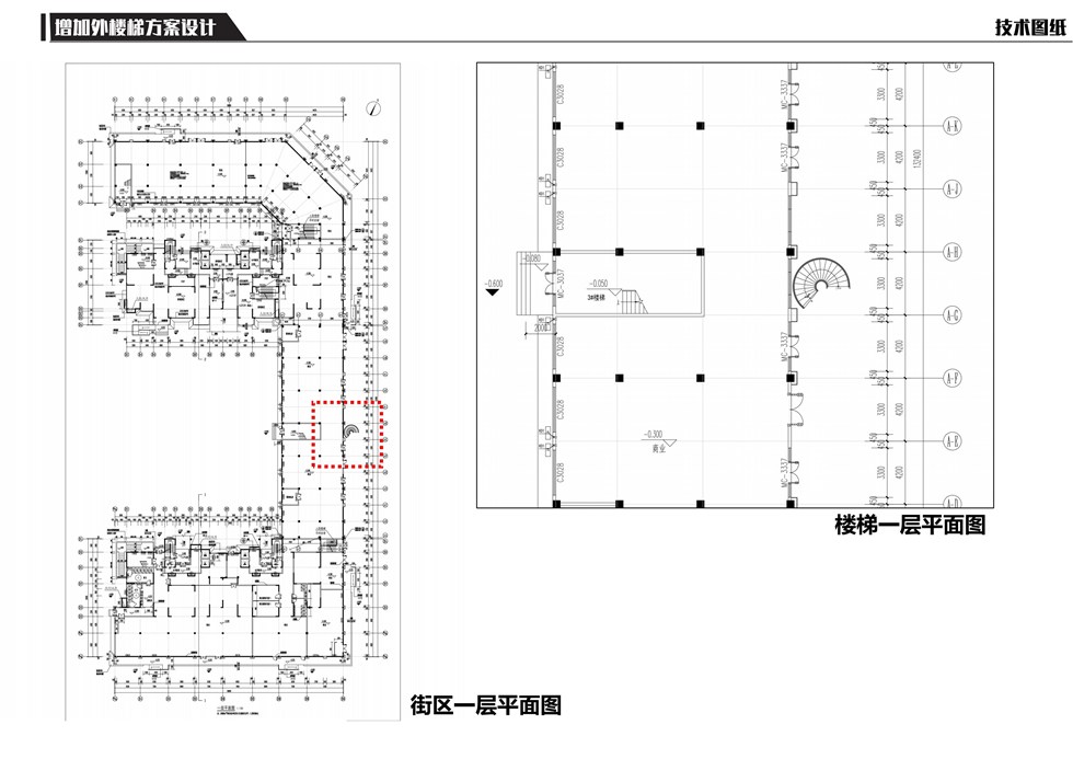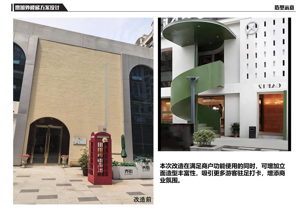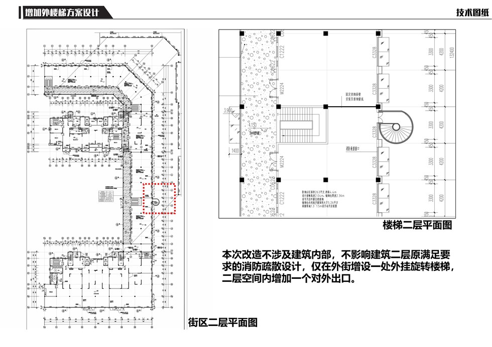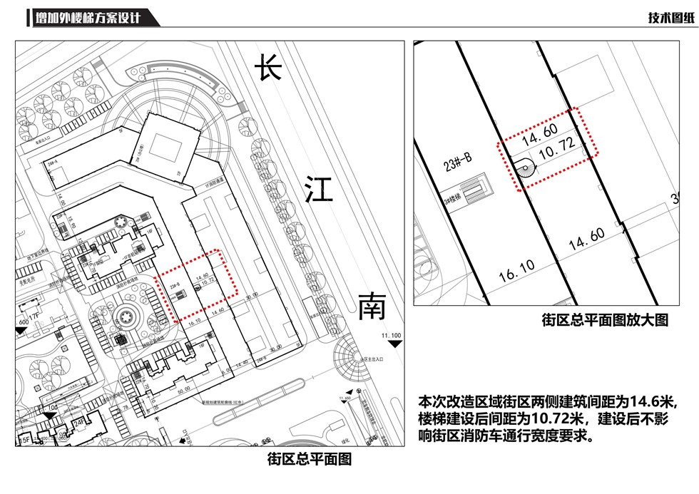 经建设单位申请,拟在富景垚小区22、23号楼A、B商业街内计划增加一处外挂旋转楼梯。改造区域两侧建筑间距为14.6米,楼梯建设后间距为10.72米。改造不涉及建筑内部,不影响建筑二层原满足要求的消防疏散设计。