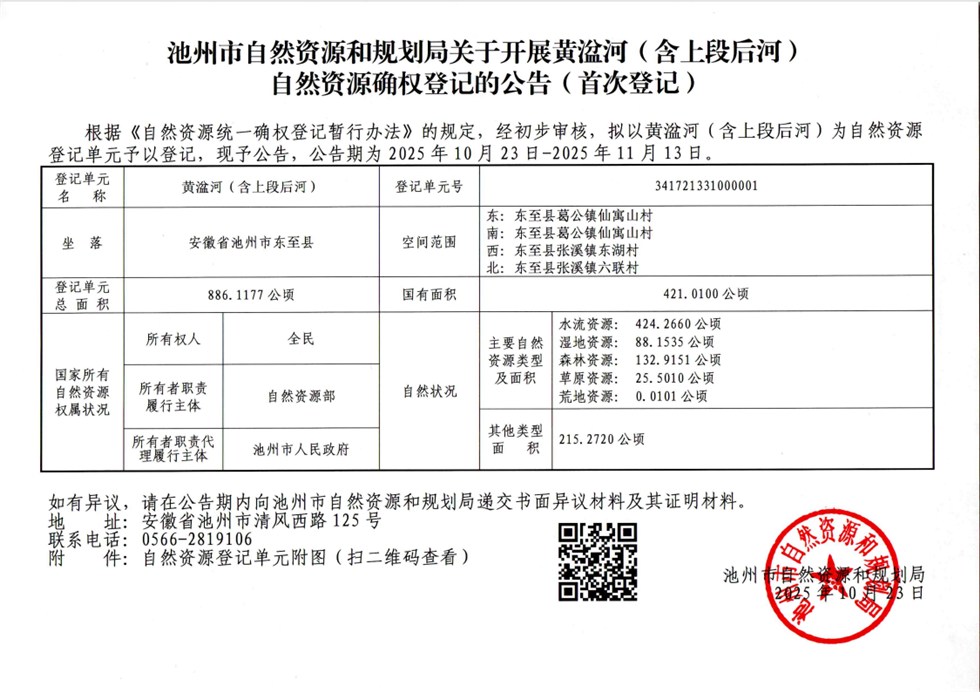 池州市自然资源和规划局关于开展黄湓河自然资源确权登记的公告(首次登记)
