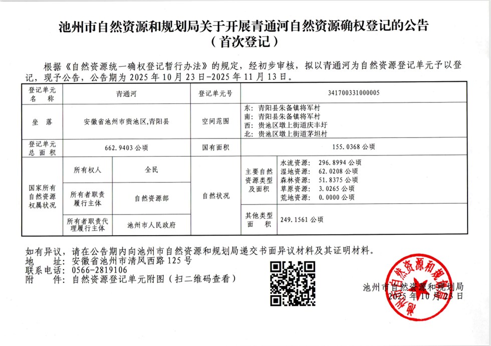 池州市自然资源和规划局关于开展青通河自然资源确权登记的公告(首次登记)