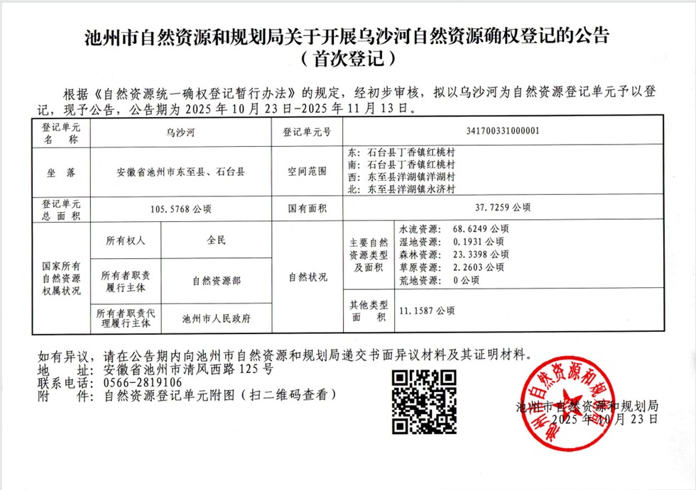 池州市自然资源和规划局关于开展乌沙河自然资源确权登记的公告(首次登记)