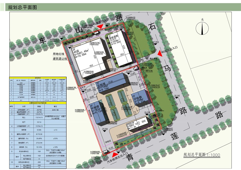 该项目位于池州市平天湖风景区车山路以南、青莲路以北石马路以西地块,地块用地面积约26798平方米(约40.1亩),该方案主要建筑6栋,分别为4S店、新能源展示大厅、安检楼、外检楼、环检楼、办公楼各一栋,总建筑面积13535.75平方米,计容面积约15704.15平方米,容积率约0.586,建筑密度约30.49%,绿地率约10.16%,机动车位160辆,非机动车位200辆。
