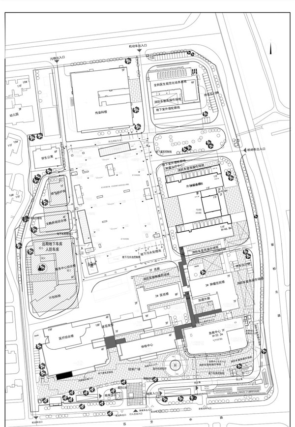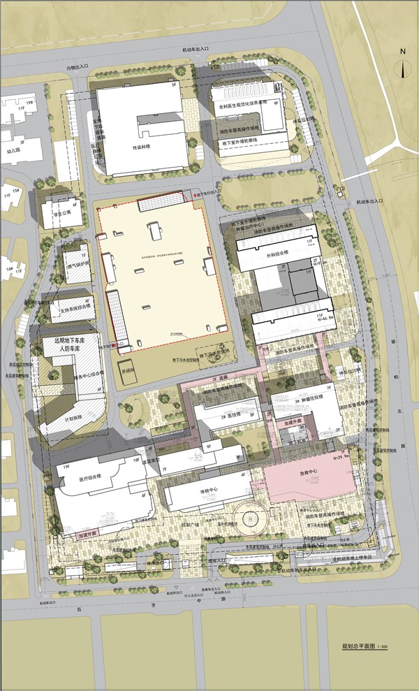 市人民医院位于中心城区翠柏路以西、百牙路以北,总用地面积约78263平方米。根据2022年3月批准的规划方案,医院规划总建筑面积204990.29平方米(计容面积153762.29平方米,地下面积约51228平方米),规划建设连廊总面积约1707.18平方米,主要连接医疗综合楼、急救中心、医技楼、肿瘤住院楼和外科综合楼。