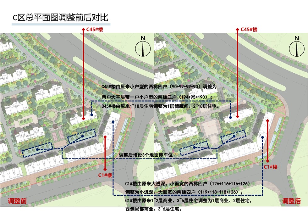 1、C1#楼建筑进行调整,保持两梯四户形式,对户型进行调整,将原规划1~2层商业、3~6层住宅调整为1层商业、2~6层住宅;将C45# 楼原规划的建筑平面两梯四户形式调整为两梯三户,将原规划1~18层住宅调整为1层储藏间、2~18层住宅。