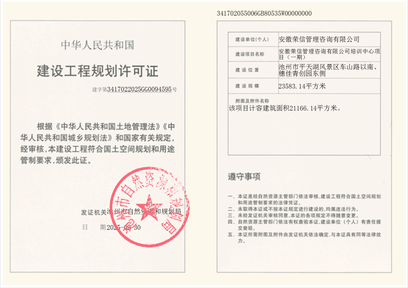 安徽荣信管理咨询有限公司培训中心项目(一期)《建设工程规划许可证》批后公布