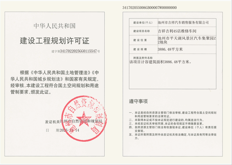 吉祥吉利4S店维修车间《建设工程规划许可证》批后公布
