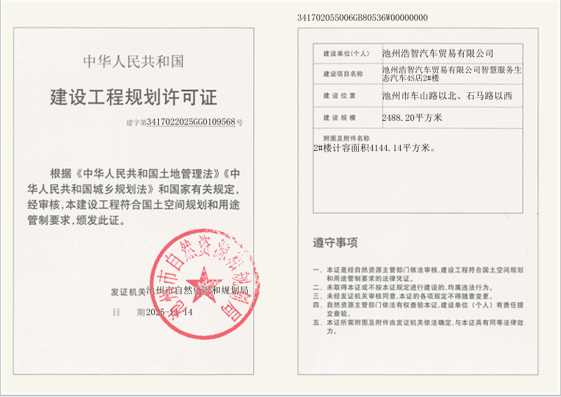 池州浩智汽车贸易有限公司智慧服务生态汽车4S店2#楼《建设工程规划许可证》批后公布