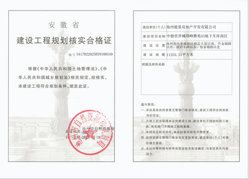 中骏世界城璟峰雅苑A3地下车库南区《建设工程规划核实合格证》批后公布