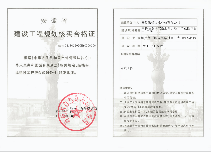 中科音瀚(安徽池州)超声产业园项目-4#厂房《建设工程规划核实合格证》批后公布