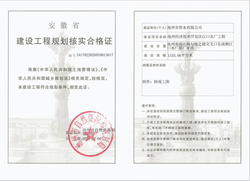 池州经济技术开发区江口水厂工程《建设工程规划核实合格证》批后公布