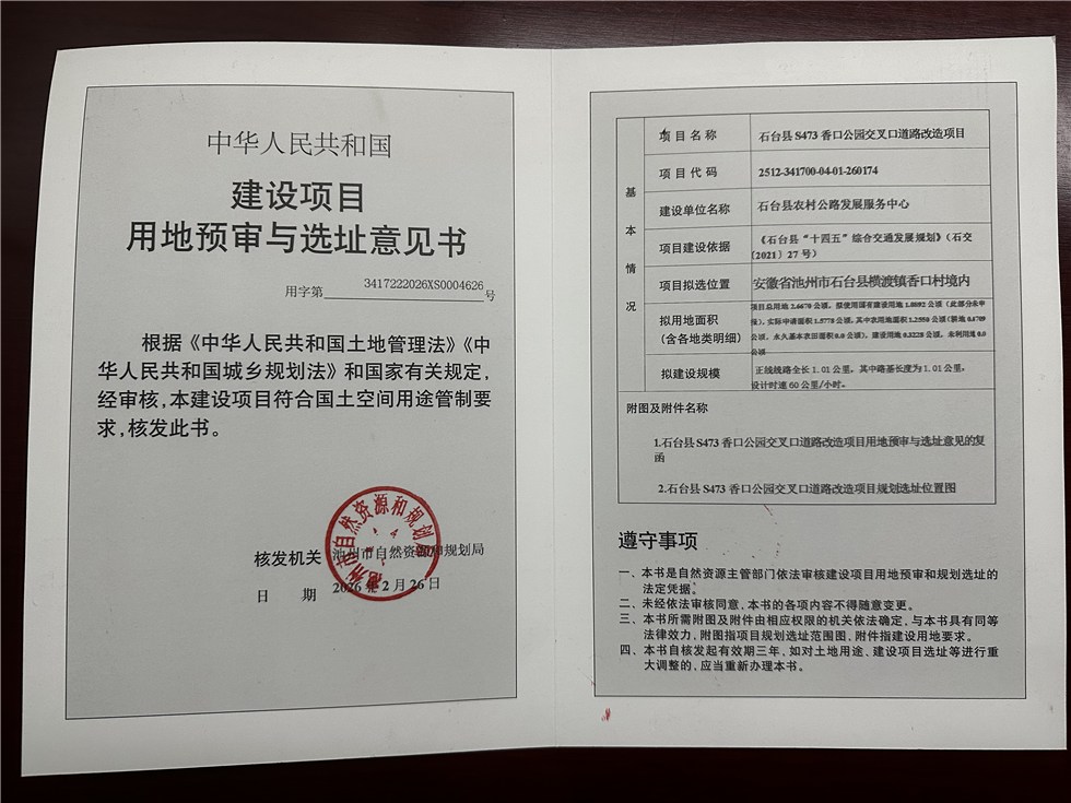 名称: 石台县S473香口公园交叉口道路改造项目《建设项目用地预审与选址意见书》批后公布 文号: