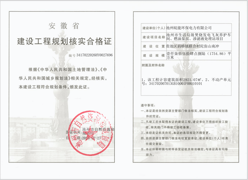 池州市生活垃圾焚烧发电飞灰养护车间、燃油泵房、渗滤液处理站项目《建设工程规划核实合格证》批后公布