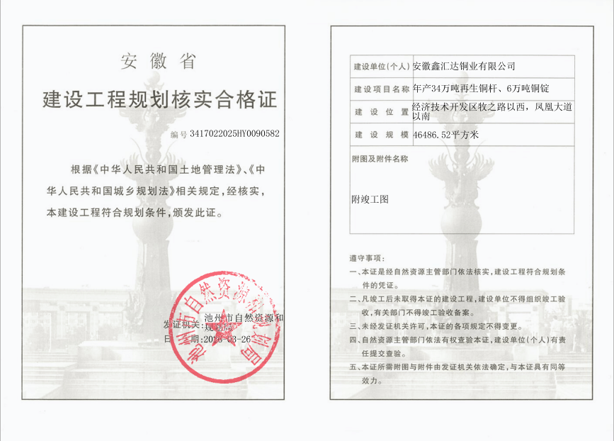 年产34万吨再生铜杆、6万吨铜锭《建设工程规划核实合格证》批后公布