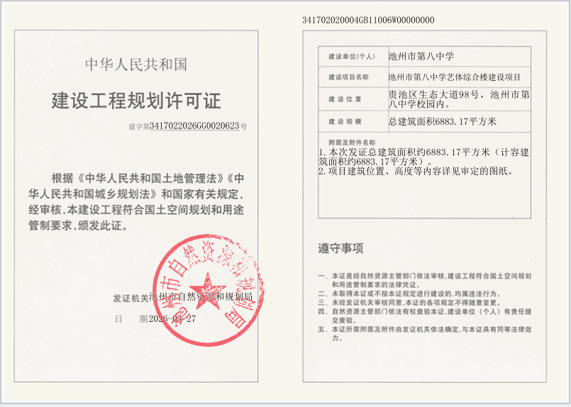 池州市第八中学艺体综合楼建设项目《建设工程规划许可证》批后公布